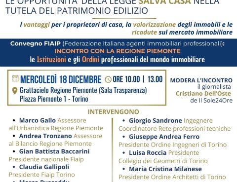 Le opportunità della legge Salva casa nel convegno di mercoledì 18 dicembre 10-13 al Grattacielo della Regione Piemonte in Sala Trasparenza, piazza Piemonte 1 “INSIEME PER LA CASA” LE OPPORTUNITA’ DELLA LEGGE SALVA CASA NELLA TUTELA DEL PATRIMONIO EDILIZIO I vantaggi per i proprietari di casa, la valorizzazione degli immobili e le ricadute sul…